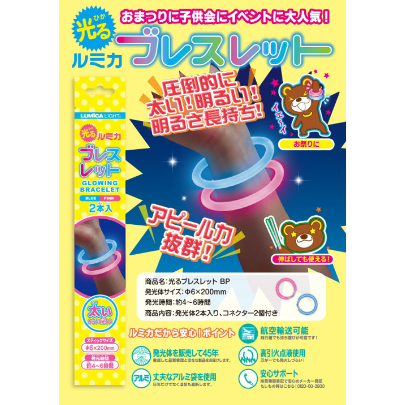 | 注意事項 | ※温度が低いところだと発光の化学反応が鈍くなり比較的長時間の発光を保ちます。 逆に熱いところだと発光の化学反応が促進され比較的短時間の発光になります。 |