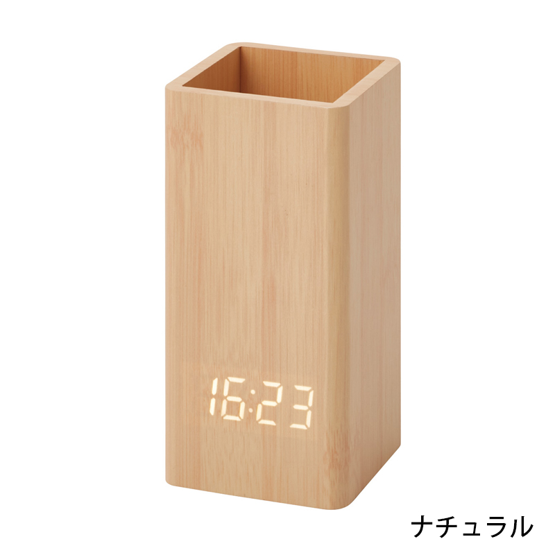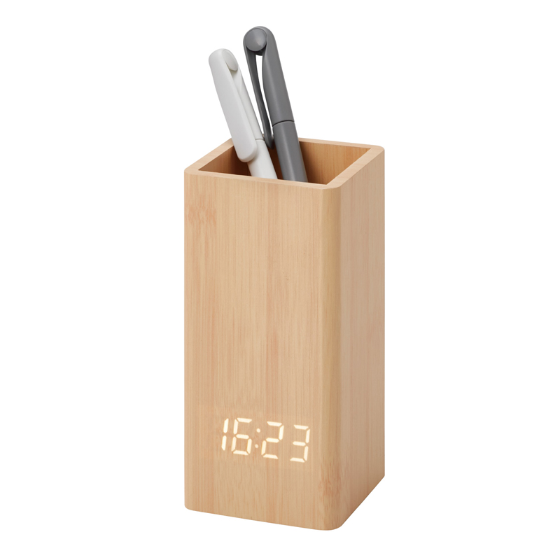 ペンスタンド機能の付いた、スタイリッシュな木製LEDクロック。