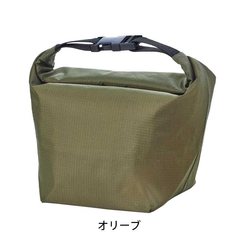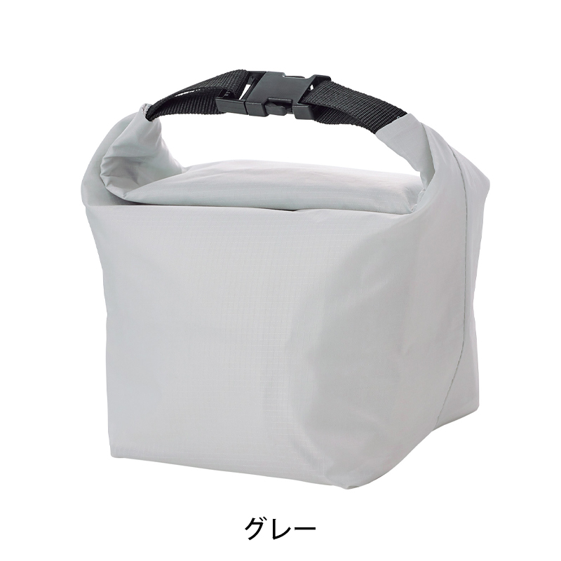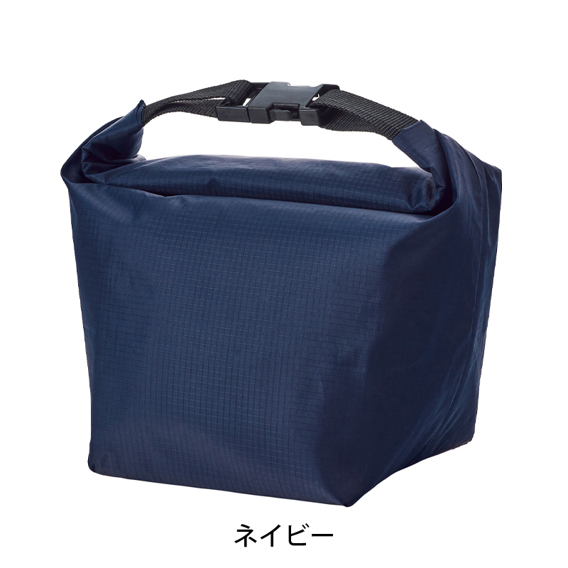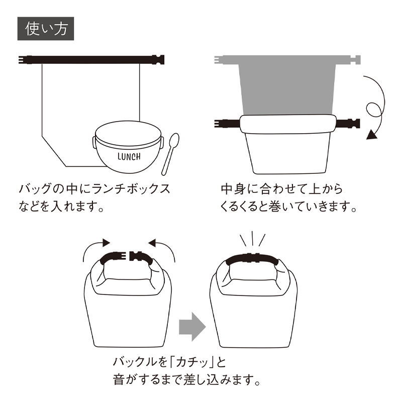 ・袋の上端をくるくると折り返して、左右の差し込みバックルをリング状に留めると、持ち手付きの保冷温ランチバッグに!