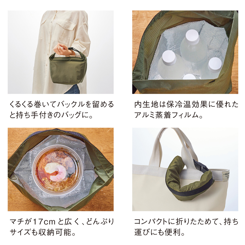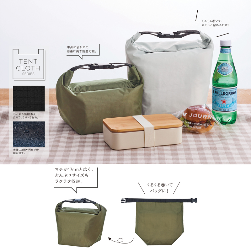 くるくる巻いて、カチっと留めるだけ! 中身に合わせて高さ調節可能な保冷温ランチバッグ。