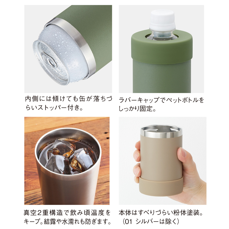 350mlのペットボトルホルダー、缶クーラーにもなる 真空2重構造の3WAYステンレスボトル。