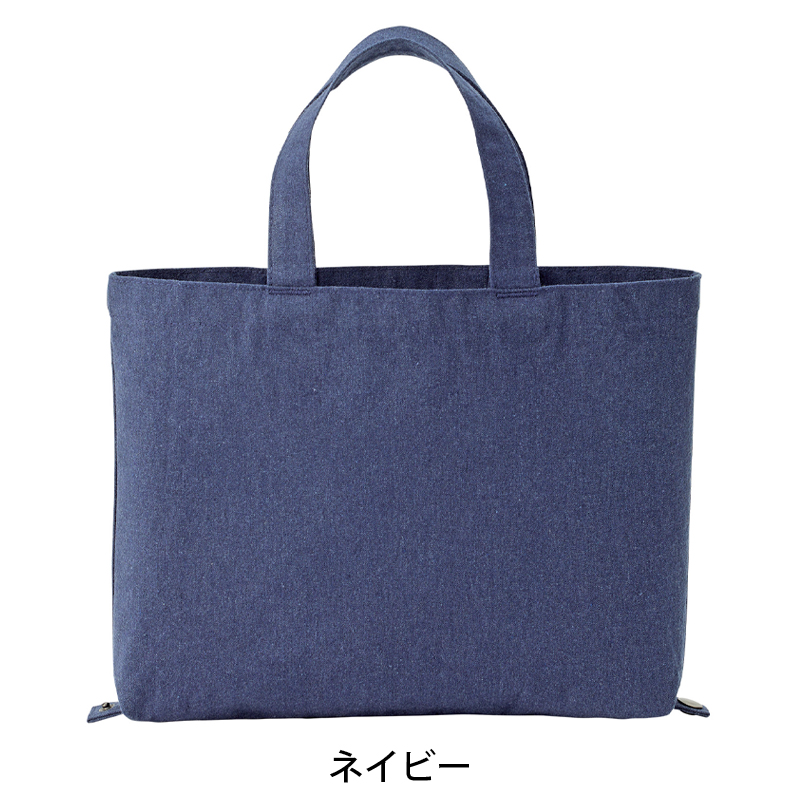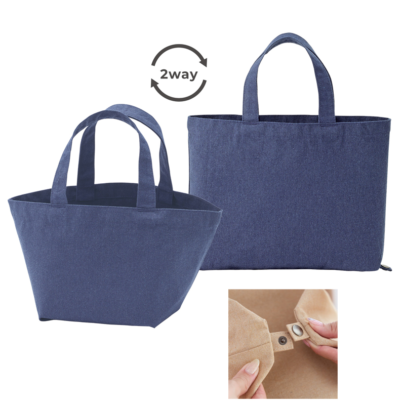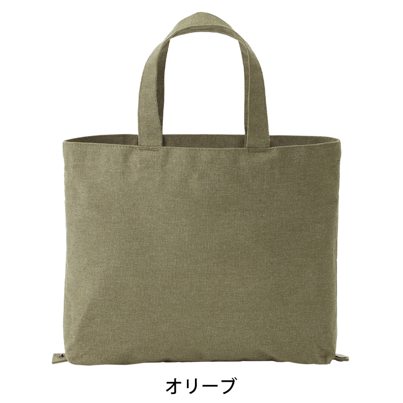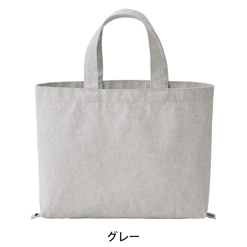 底面のボタンで形状が変えられる、再生素材100%の2wayキャンバストート。