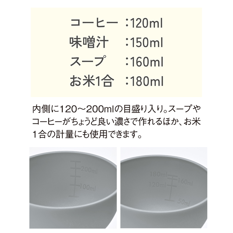 ・内側に120~200mlの目盛入り。スープやコーヒーが丁度良い濃さで作れる他、お米1合の計量にも使用可能。