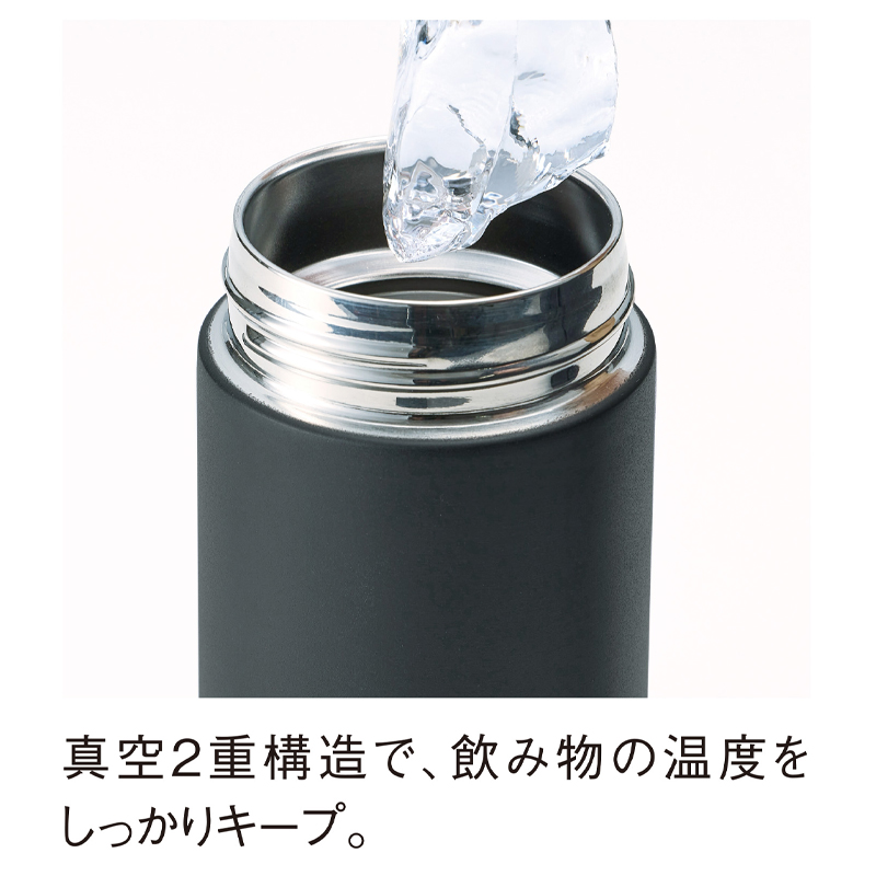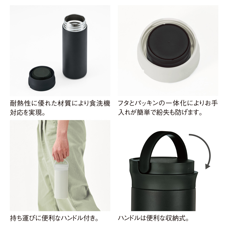 フタとパッキンが一体型+食洗器対応。 お手入れが簡単な真空2重構造のステンレスボトル。