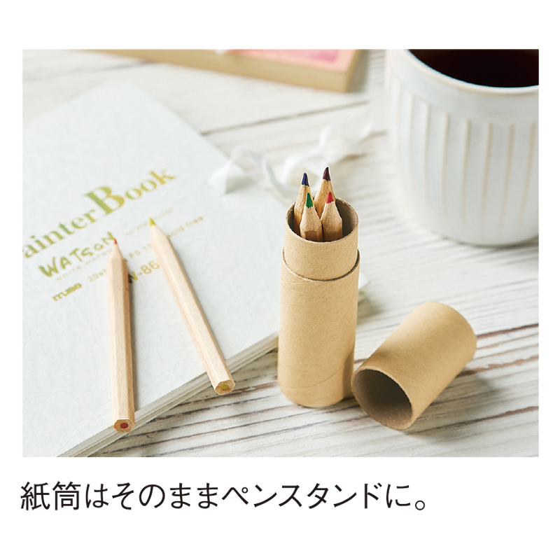 あか・あお・あかむらさき・だいだい・きいろ・みどりの色鉛筆6色をひとセットにまとめました!色鉛筆は、お子様が持ちやすい軽くて小さめのサイズで、ケースもコンパクト。紙筒がそのままペンスタンドに。6本入りをご用意しました。