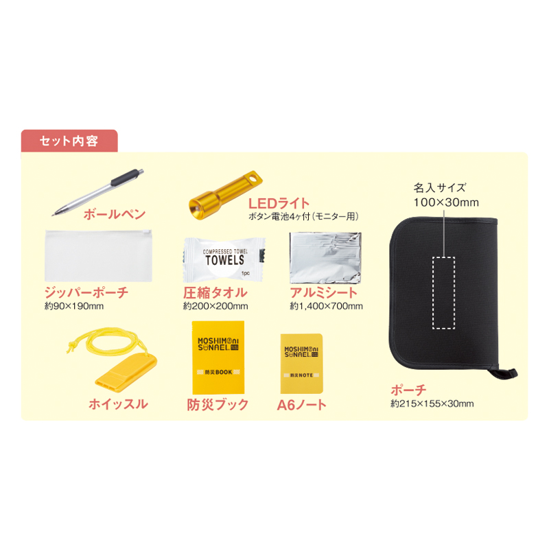手のひらサイズのコンパクトなホイッスルやLEDライト、無地ノートやペンなどが入った防災持ち出し9点セットです。